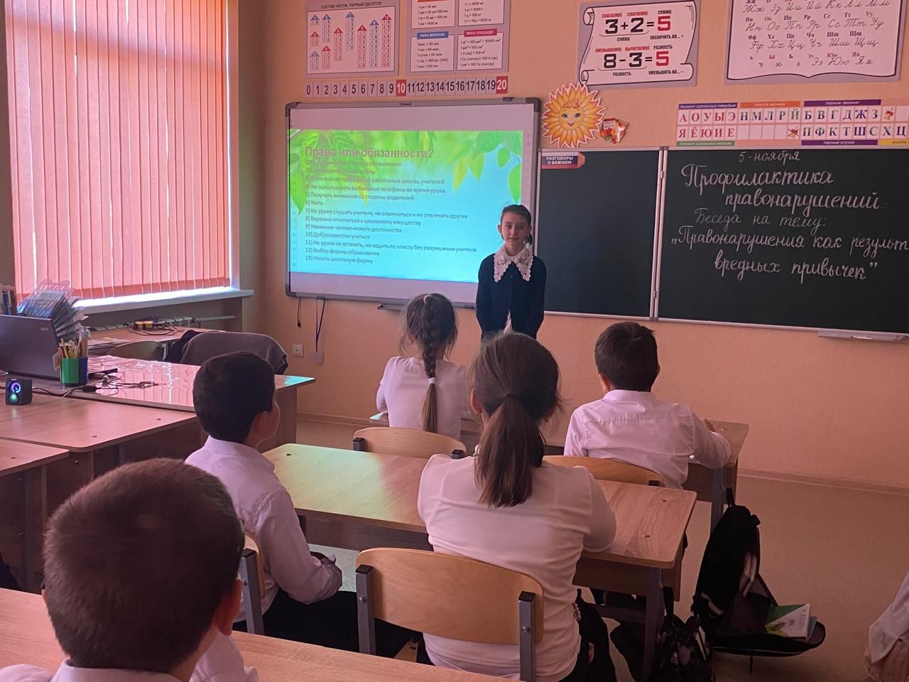 07.11.2025. В 4 классе ( клас.руководитель Туаллагова Л. А.) прошла беседа на тему: « Правонарушения как результат вредных привычек». Цели и задачи: способствовать осознанию детьми взаимосвязи вредных привычек и правонарушений; расширить представления детей о взаимосвязи вредных привычек и правонарушений.