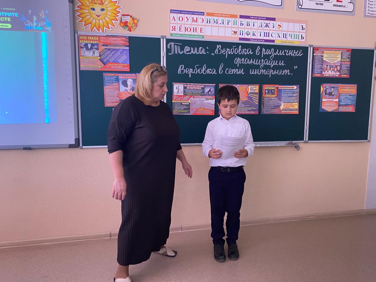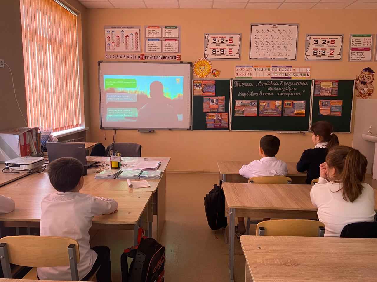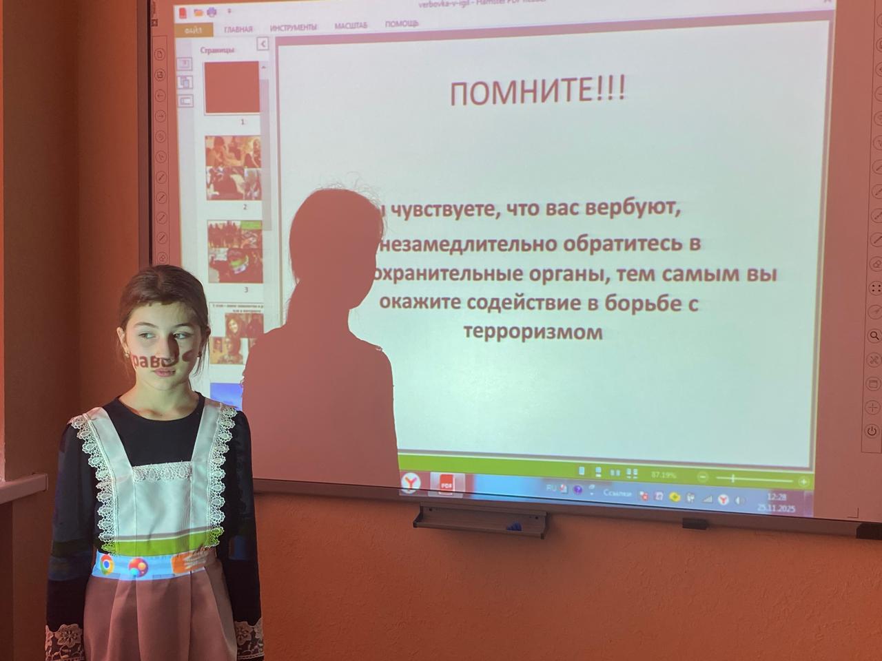 25.11.2025. В 4 классе ( кл рук. Туаллагова Л.Л.) прошёл классный час по теме: « Вербовка детей в различные организации. Вербовка в сети интернет.» Главная цель: объяснить учащимся как проводят работу по вербовке в свои ряды террористы.Ученики посмотрели видеоролик,разобрали плакаты, обсудили ситуации и пришли к выводу, что нужно проверять любую информацию.Если вы чувствуете, что вас вербуют, незамедлительно обратитесь в полицию.